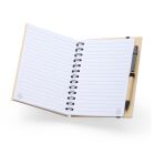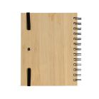 Caderno B6 espiral com capa dura em bambu, 70 folhas pautadas de papel reciclado e suporte para esferográfica. Esferográfica em bambu inclusa. 13×18 cm