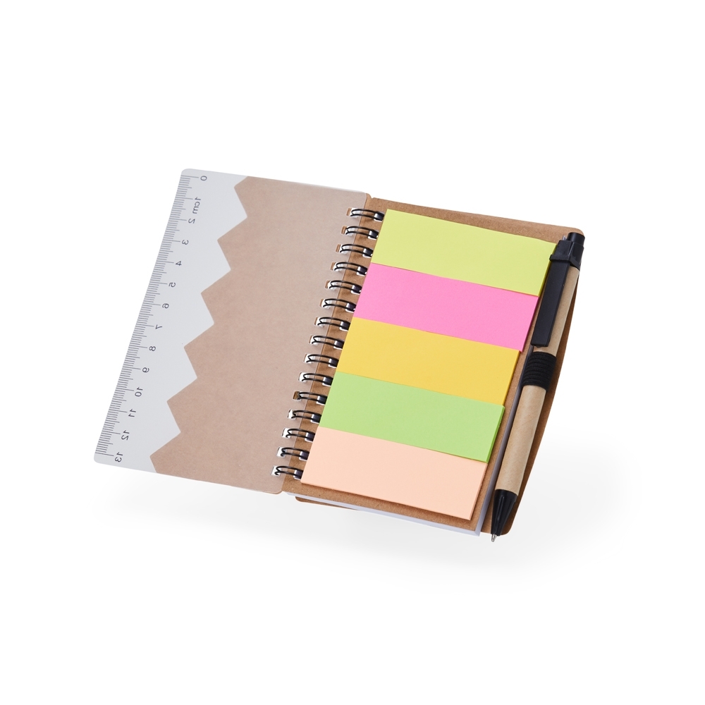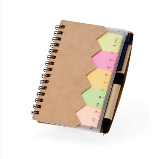 Bloco de Anotações com Régua, Autoadesivos e Caneta.