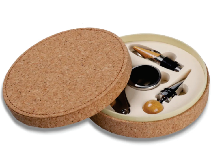 Kit Vinho 5 peças, contendo: Estojo redondo de cortiça com base emborrachada bege claro; Saca Rolha de metal com detalhes em bambu; Corta gotas de metal; Bico para servir de metal com tampa acoplada em bambu; Tampa de metal com detalhe em bambu.